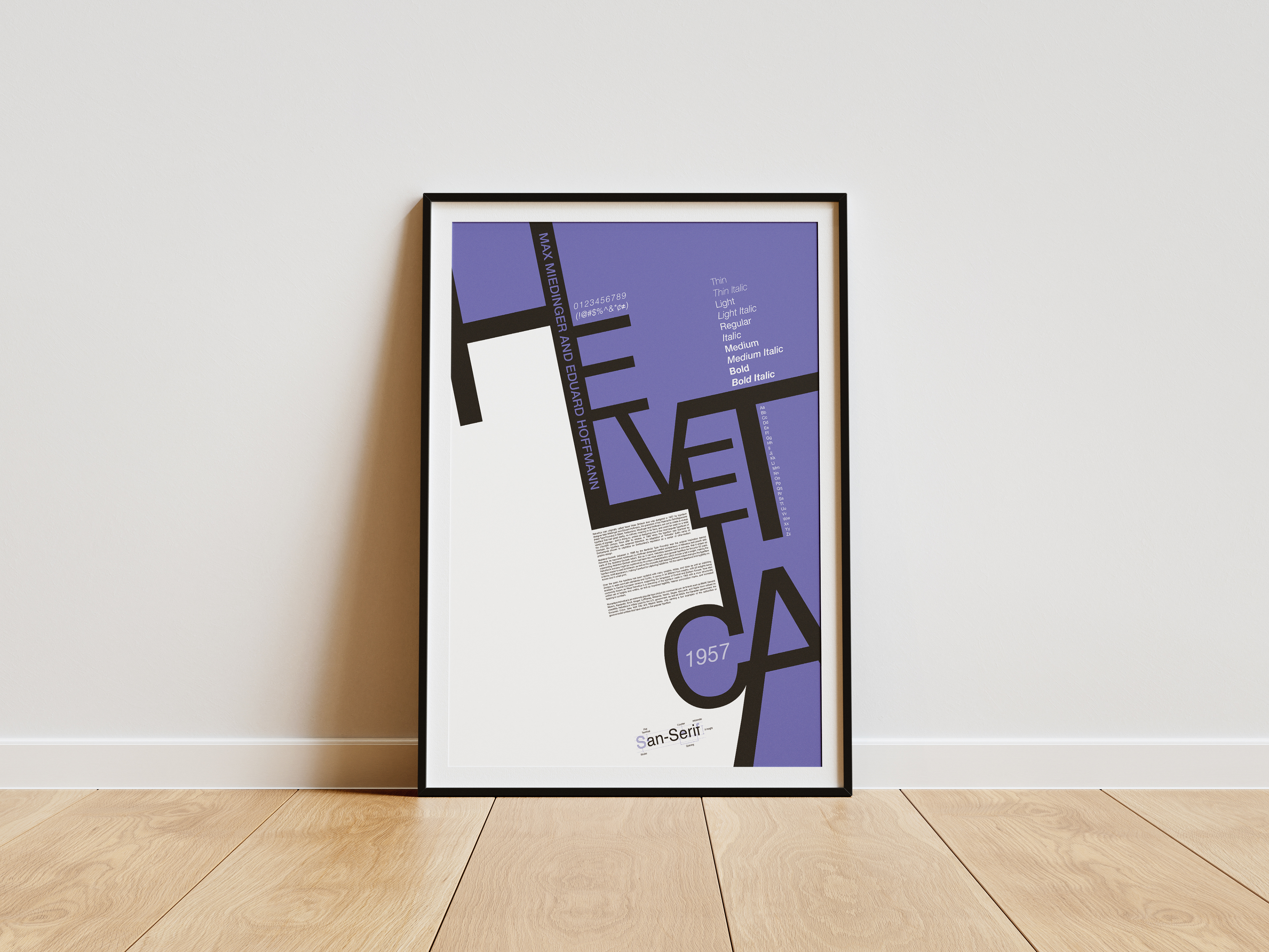 A type specimen poster shows the different qualities and characteristics of a font family in a persuasive manner so people will want to use the font family. This Helvetica poster shows every variation in the typeface with a central visual element in an interesting way that says Helvetica.
